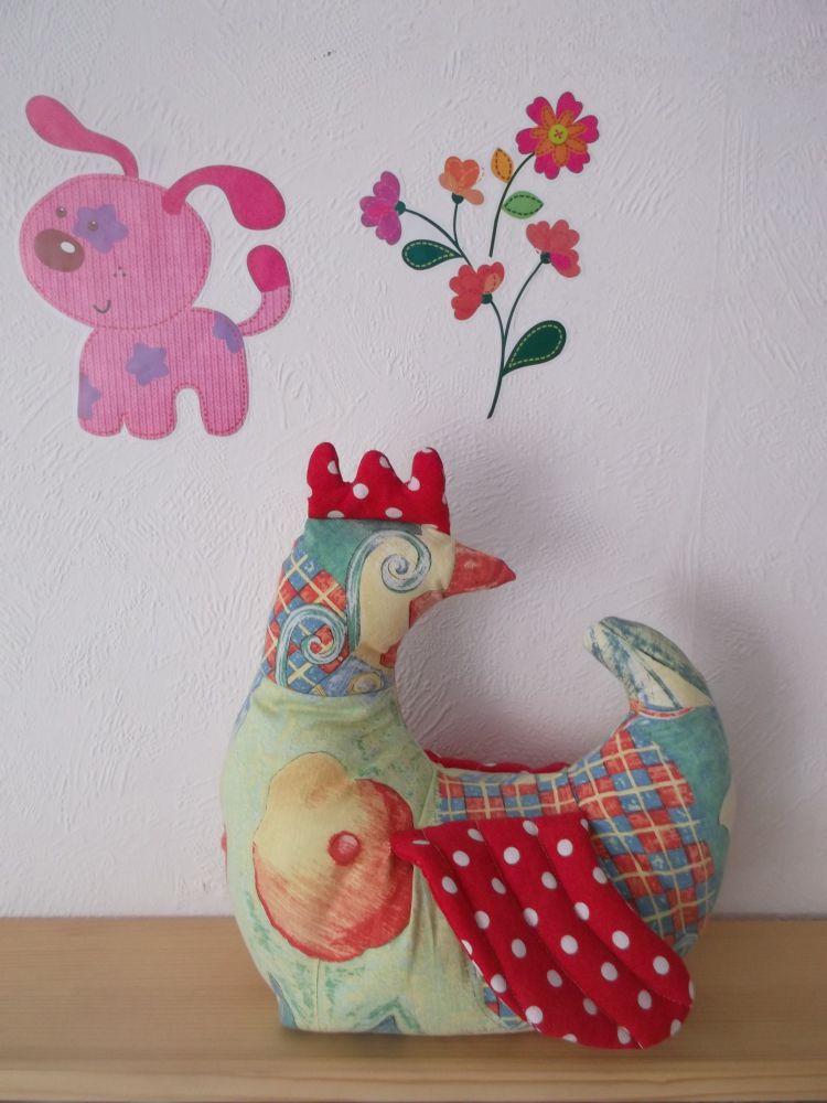 Ez a szépséges tyúkocska egy kiszuperált asztalterítőből és egy kis pöttyös vett anyagból készült a lányom nagy örömére. Olyan jól eltalált mintával rendelkezik, ehhez a projekthez, hogy még szemet sem kellett varrnom, mert az anyagban már benne volt. Szeretünk a lányommal együtt énekelni és ez a tyúkocska elkészülte után se volt másképp. Mi az "Én elmentem a vásárba fél pénzzel..." kezdetű dalt szoktuk eljátszani vele.